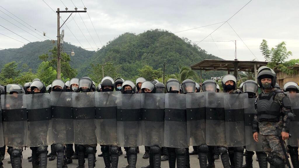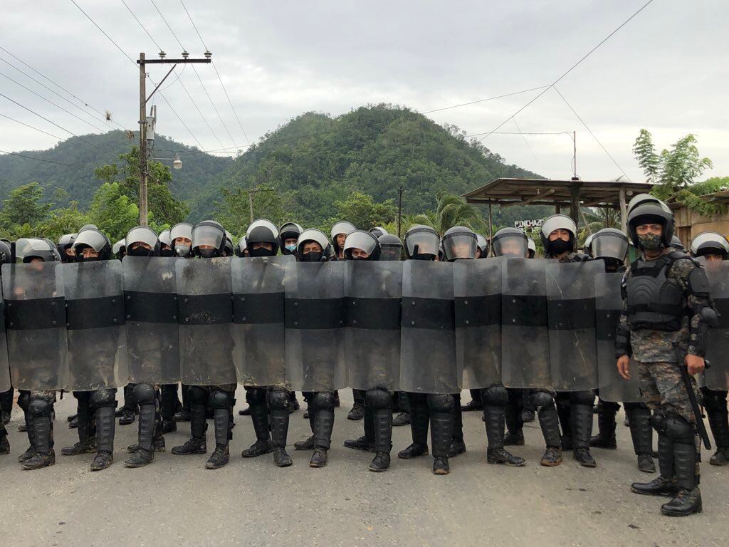 Una barrera militarizada encontró un grupo de migrantes hondureños que este domingo continuó su paso por la aldea Chocón, en Livingston, Izabal.