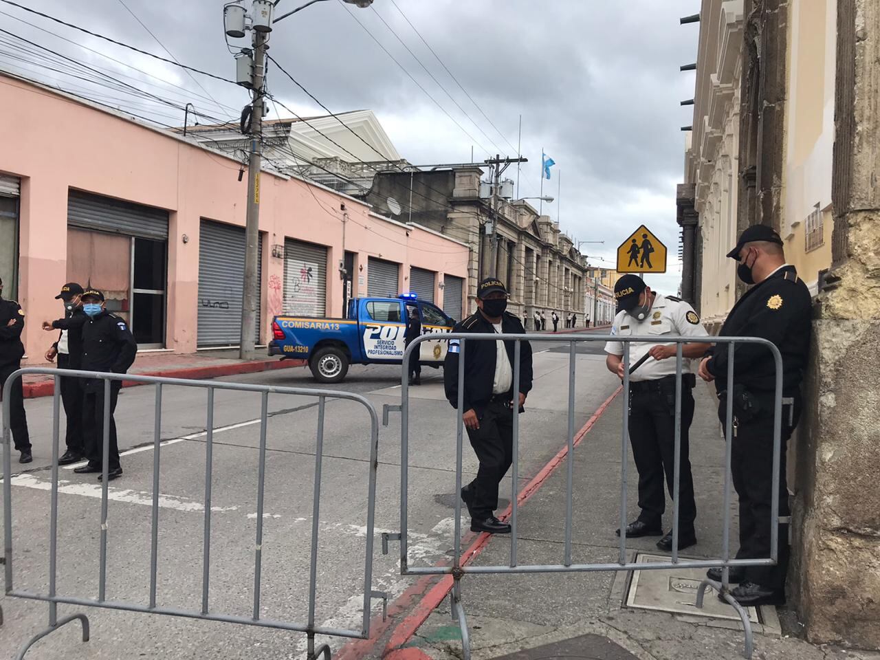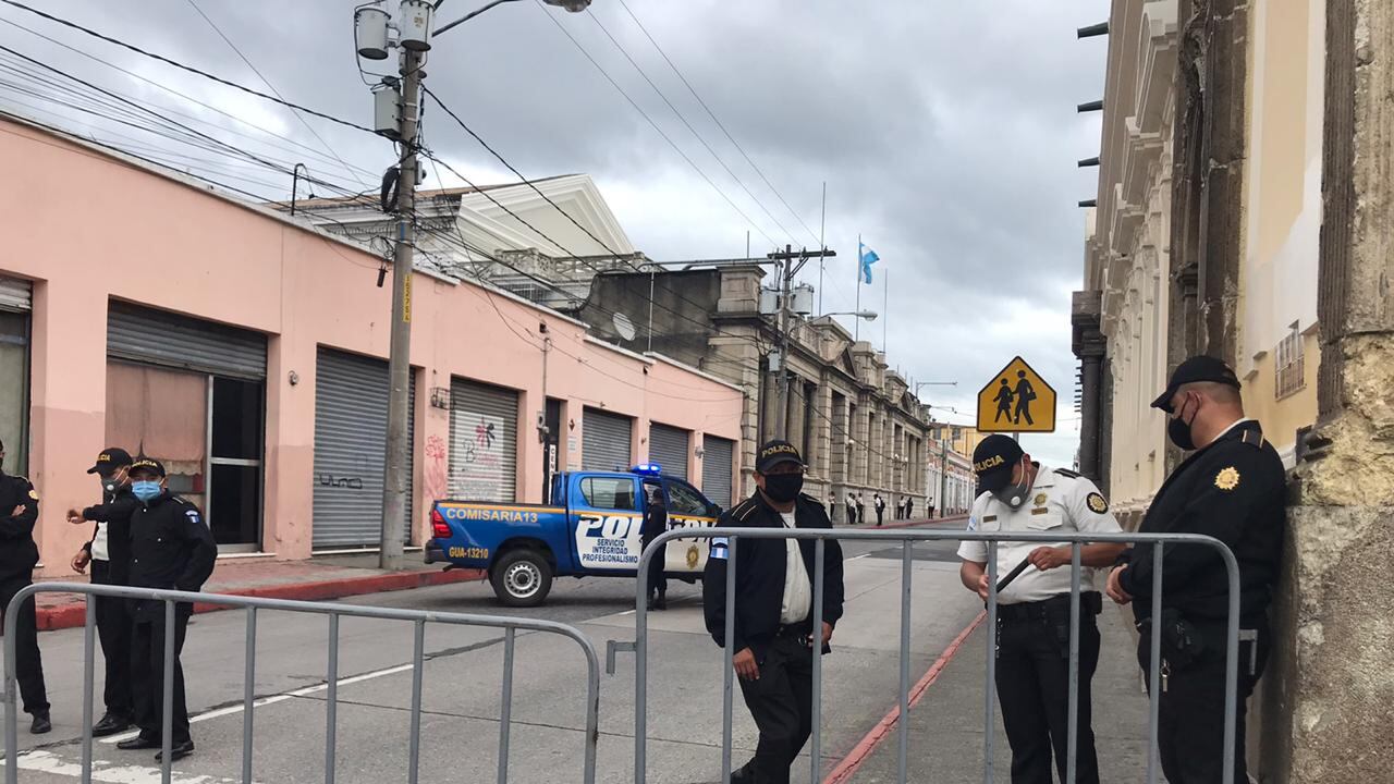 Elementos de la Policía Nacional Civil (PNC) colocaron bardas en la calle para bloquear el paso hacia el Congreso de la República.
