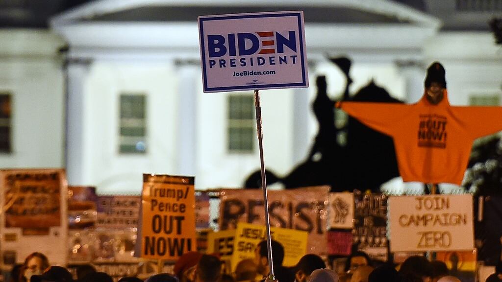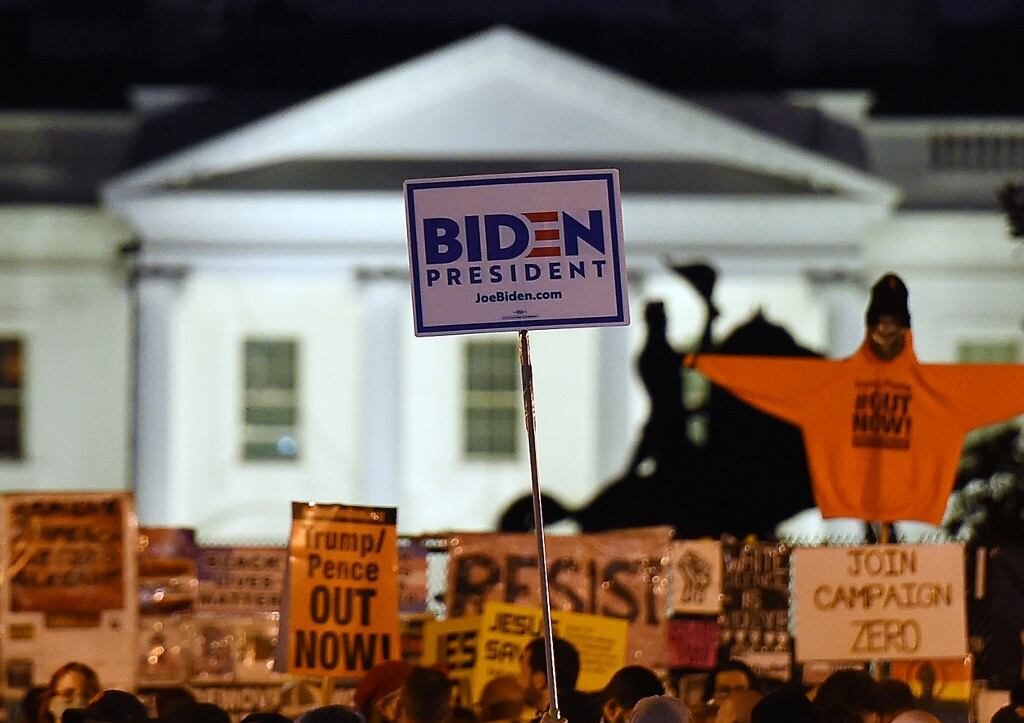 Cientos de partidarios del candidato demócrata, Joe Biden, se congregaron el martes en la Plaza Black Lives Matter, frente a la Casa Blanca, en Washington, para esperar los resultados de las elecciones presidenciales en Estados Unidos.