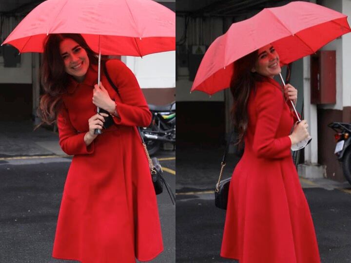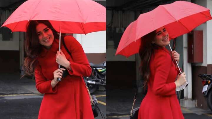 La diputada aparece en el parqueo del Congreso de la República, viste un abrigo de color rojo y sostiene una sombrilla.