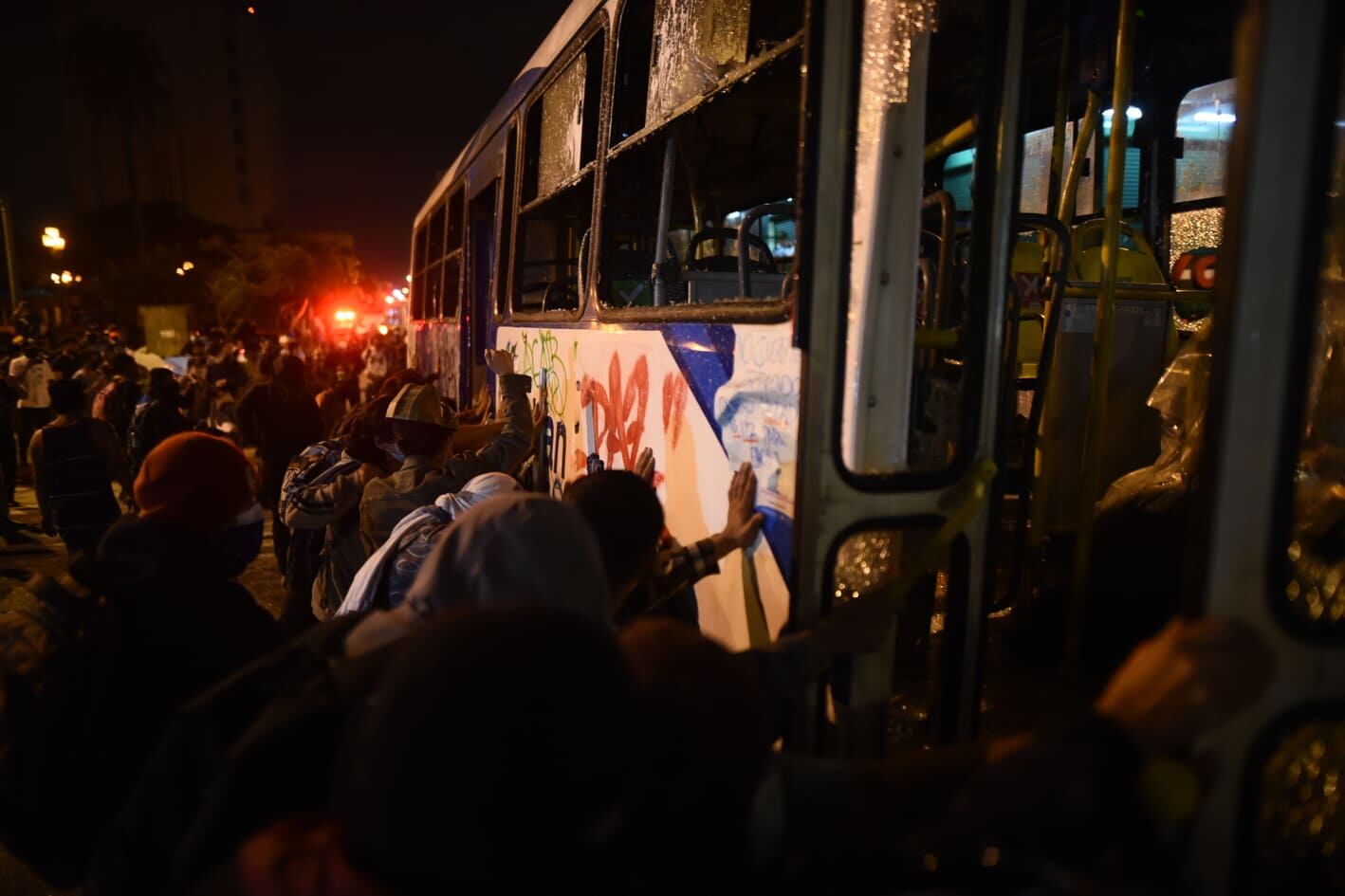 Una unidad del Transurbano fue quemada a un costado del Palacio Nacional de la Cultura por varias personas que tenían el rostro cubierto en su mayoría, durante la manifestación del sábado, 28 de noviembre.