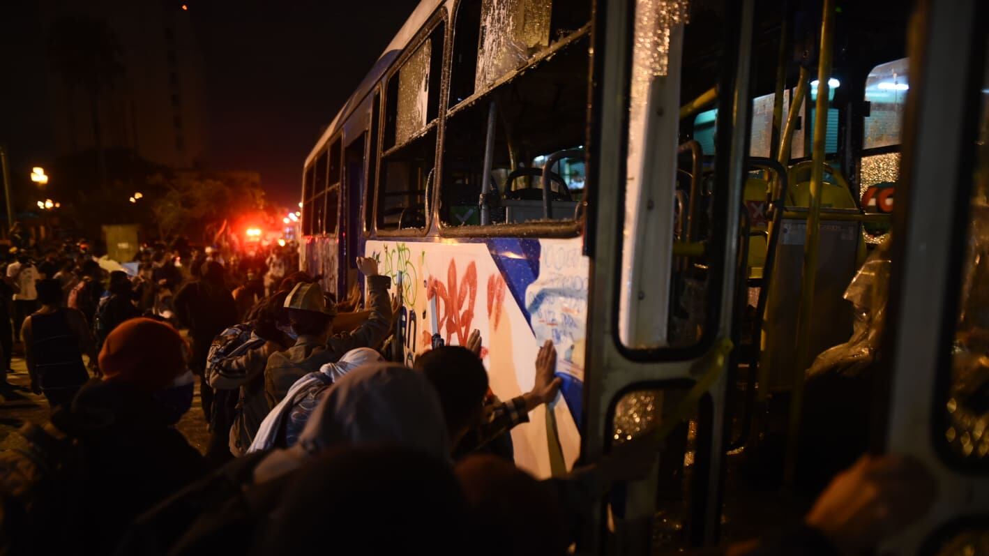 Una unidad del Transurbano fue quemada a un costado del Palacio Nacional de la Cultura por varias personas que tenían el rostro cubierto en su mayoría, durante la manifestación del sábado, 28 de noviembre.