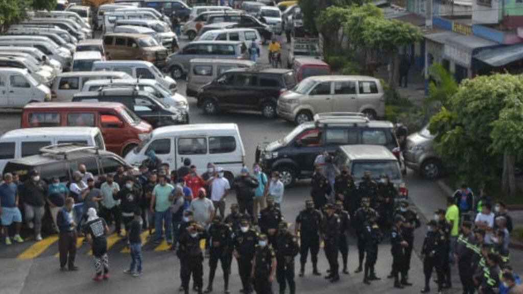 Elementos de la Policía Nacional Civil (PNC) que intentan disuadir a los inconformes a deponer las acciones de hecho.