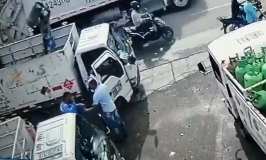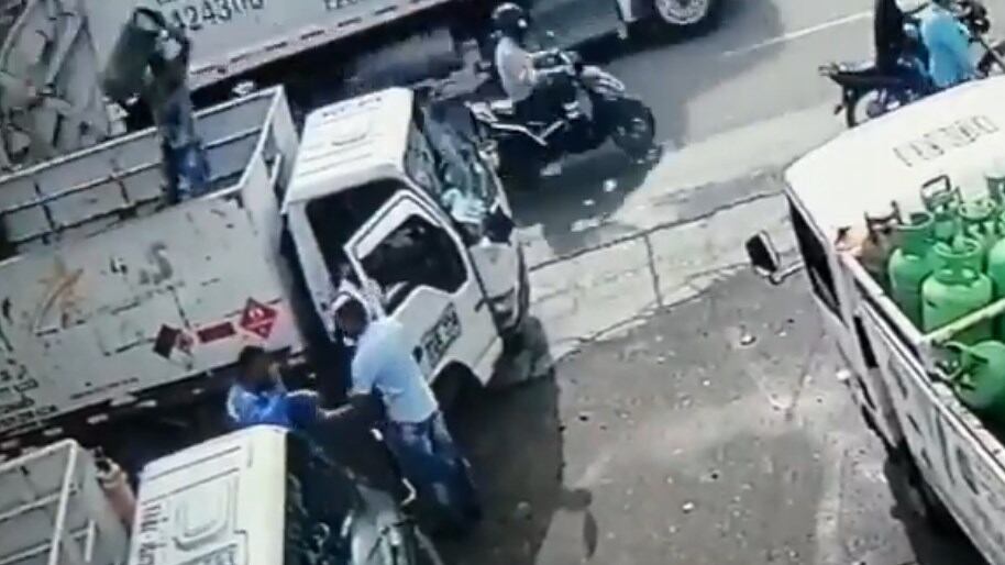 Una cámara de seguridad captó el momento en el que un ladrón intentó asaltar a dos vendedores de gas domiciliario en el barrio Ternera, en Cartagena, Colombia, sin saber que terminaría golpeado y arrestado.