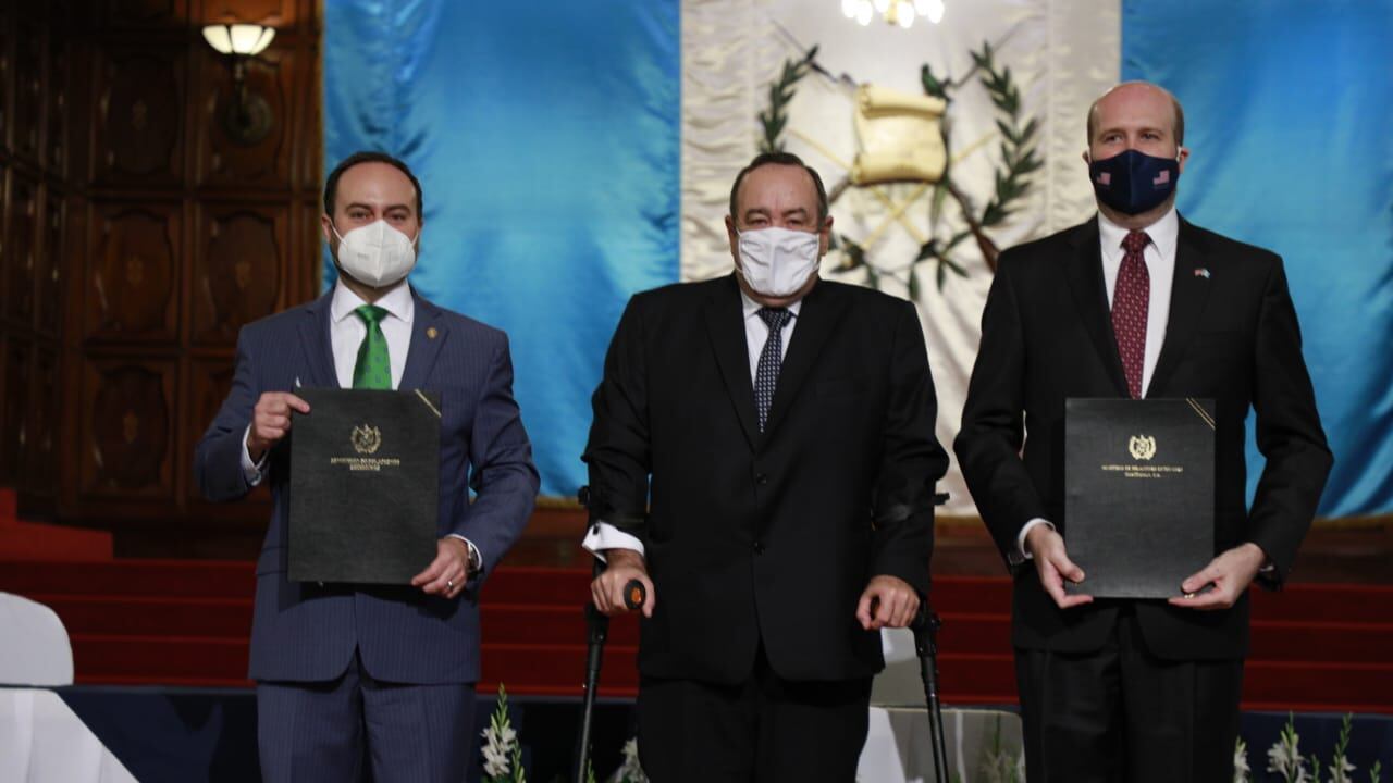 La firma de la iniciativa América Crece estuvo a cargo del presidente, Alejandro Giammattei, del canciller Pedro Brolo y del embajador de EE.UU., William W. Popp.