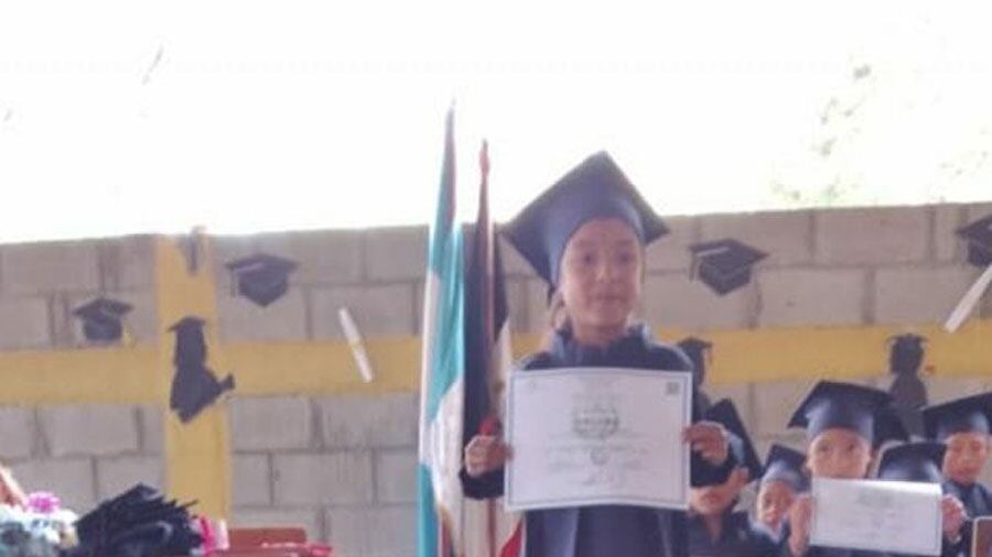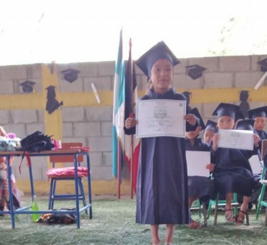 La niña estudió en la Escuela Oficial Rural Mixta de la aldea Patzam. Para conmemorar el logro, su familia le tomó dos fotografías.