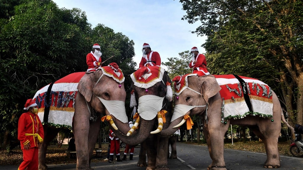 Los elefantes llamados Sri Mongkon, de 14 años, Sri Raya, de 6, Peter, de 15, y King Kaew, de 18, transportaban en sus trompas cestas con mascarillas para distribuir en el exterior de la escuela Jirasat Wittaya, en Ayutthaya, a una hora de Bangkok. Mientras, niños cantaban villancicos y se hacían fotografías con los paquidermos.