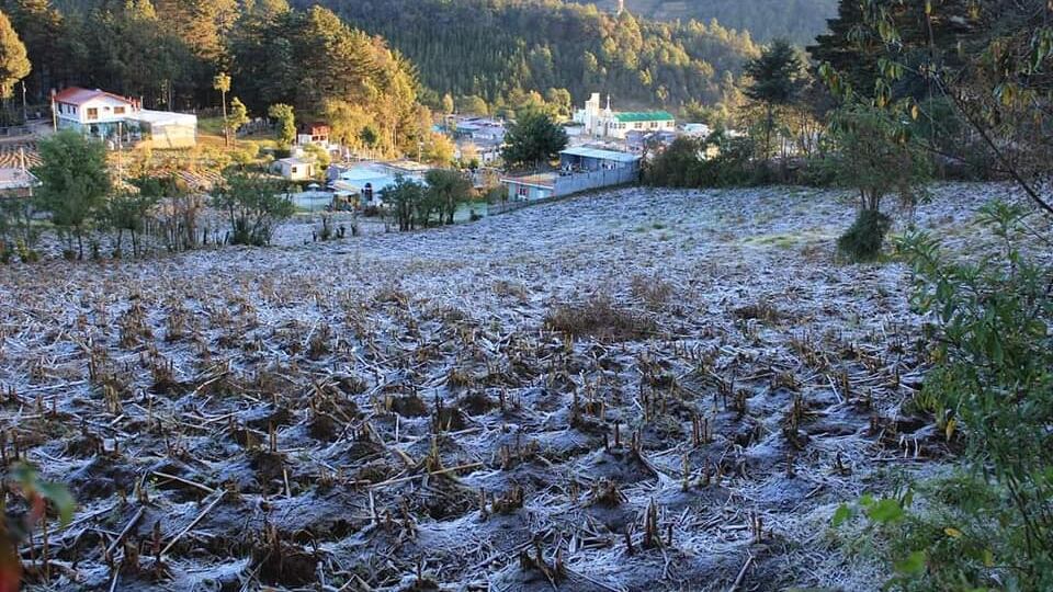 Los campos de la comunidad Chuixchimal se veían con un resplandor que se originaba por el impacto de los rayos de sol con el manto helado de la escarcha.