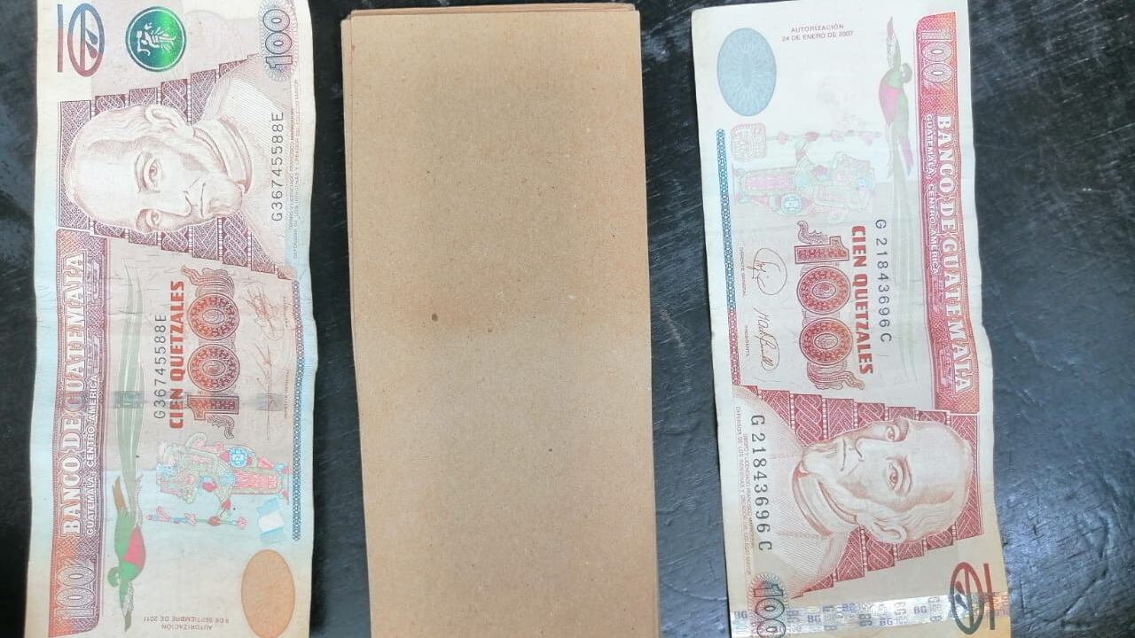 - El paquete estaba formado por dos billetes de Q100 colocados uno arriba y otro abajo, para ocultar el papel simple.
