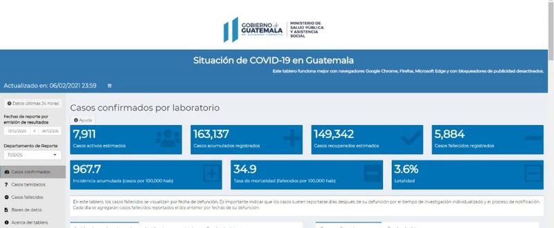 El balance de casos de Coronavirus en el país se elevó a 163 mil 137 casos, según cifras oficiales reportadas hasta el 6 de febrero de 2021.