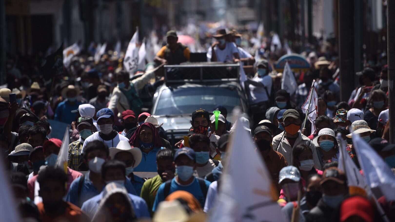 Los manifestantes, convocados por el Comité de Desarrollo Campesino (Codeca), salieron de cuatro puntos distintos de la capital para llegar a la Plaza de la Constitución, desde donde exigen la salida de Giammattei.