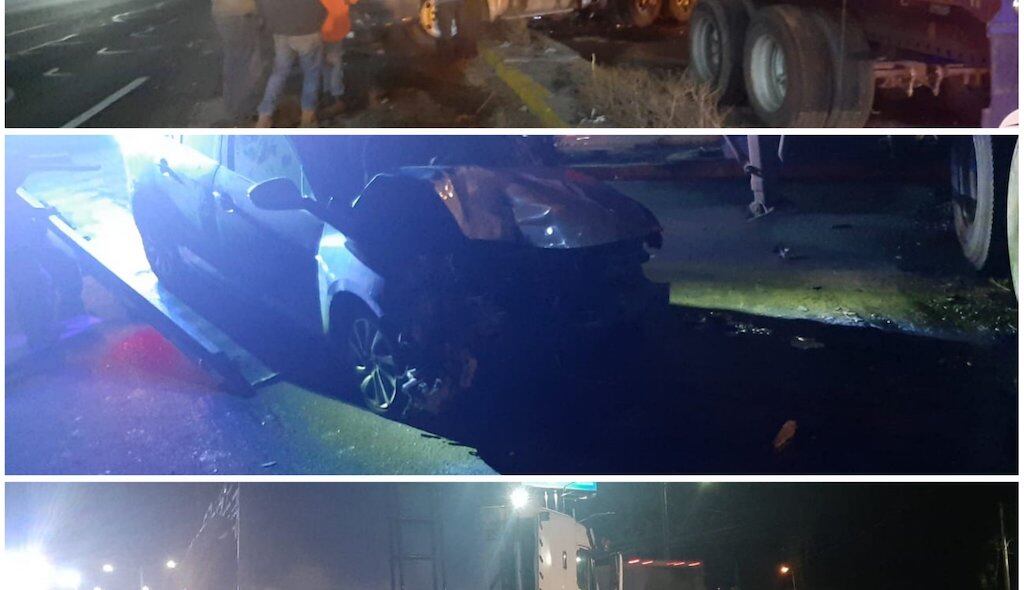 - De acuerdo con los datos, un tráiler que transportaba encomiendas colisionó a un vehículo tipo sedán en la parte trasera.