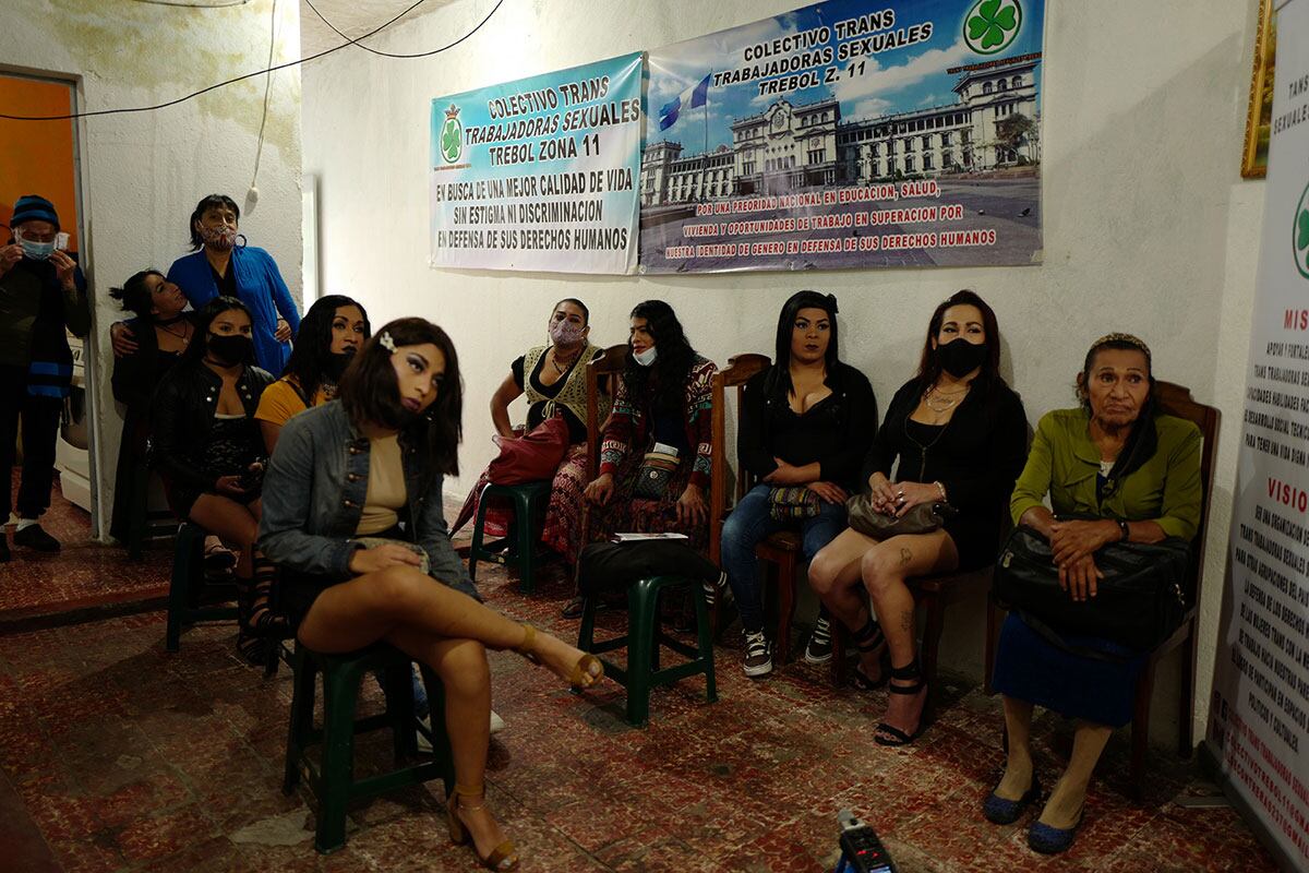 En una casa de huéspedes, las integrantes del colectivo Trébol alquilan un espacio cada vez que se reúnen, la tarifa es de 100 quetzales. Es jueves 5 de noviembre, alrededor de las tres de la tarde. Tienen que elegir a la junta directiva. Jeaneth hace una pausa, pide la atención de sus compañeras. Recuerda que en 2010 se organizaron por primera vez. Buscaban protegerse de las amenazas y extorsiones, de las que son nuevamente víctimas. Los aplausos suenan en el salón, es por la nueva directiva integrada por cinco de ellas. Preparan café para repartir entre todas. Hacen lectura de los acuerdos y argumentos que quieren tratar para darle seguimiento a sus derechos. Seguido de eso, participan en voz alta haciendo lectura bíblica sobre la prevención de adicciones al alcohol. Algunas se ríen y otras conversan en voz alta sobre sus experiencias de vida.