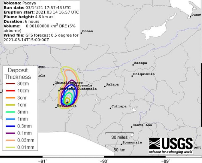 “Los pulsos de incremento favorece la formación de columnas gruesas de se ceniza que dispersan hasta 30 kilómetros en dirección del viento que puede ser variable. Esto ha generado la presencia de ceniza en San José El Bejucal, San Antonio El Pepinal, San Francisco de Sales, Concepción El Cedro y San José Calderas. Debido a las condiciones climáticas tiende a dispersarse al oeste y noroeste. Con caída de finas partículas de ceniza sobre los municipios de Amatitlán, Villa Nueva, Mixco y capital”, informó la Coordinadora.