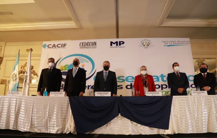 En la actividad participaron la fiscal general, María Consuelo Porras, y el titular del Registro General de la Propiedad, Luis Alfredo Pineda, quienes suscribieron un convenio con los empresarios para promover el observatorio.