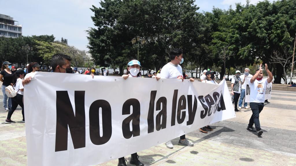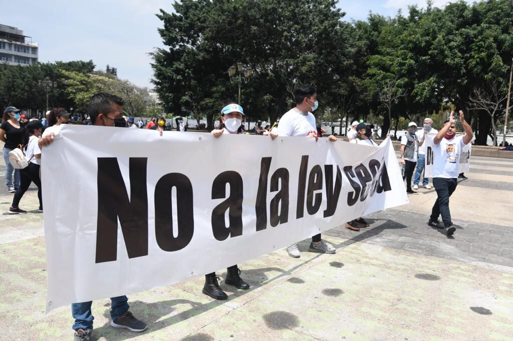 Un grupo de trabajadores de restaurantes manifestaron este viernes 23 de abril en la Plaza de la Constitución en contra de la ley seca que impuso el gobierno de Guatemala para controlar el contagio de COVID-19.
