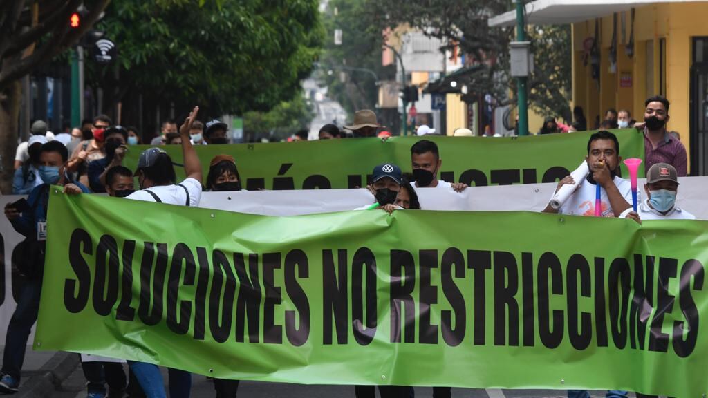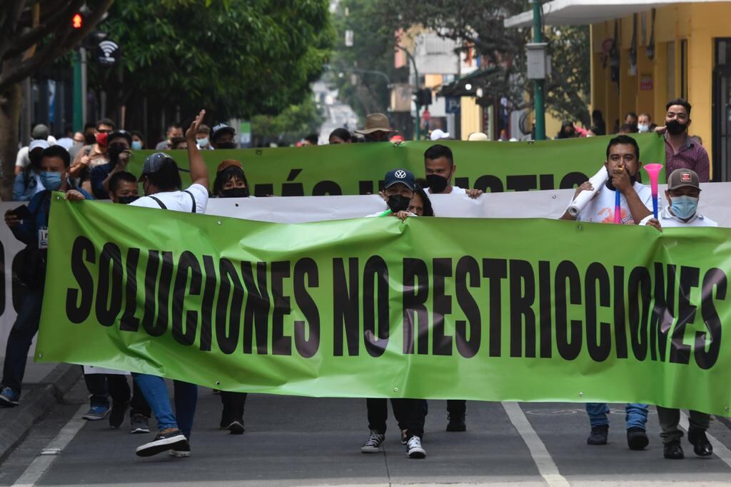 Una vez más, empleados de restaurantes caminaron por la Sexta Avenida del Centro Histórico para manifestar frente al Palacio Nacional de la Cultura en contra de las restricciones de aforos que aprobó el presidente, Alejandro Giammatteis durante 15 días.