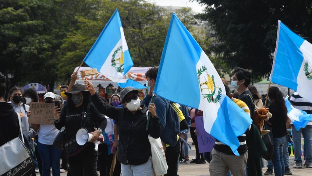Decenas de guatemaltecos se concentran en la Plaza de la Constitución, en la zona 1 capitalina, para exigir la renuncia del presidente Alejandro Giammattei, así como para para solicitar acceso a la vacuna contra el coronavirus.