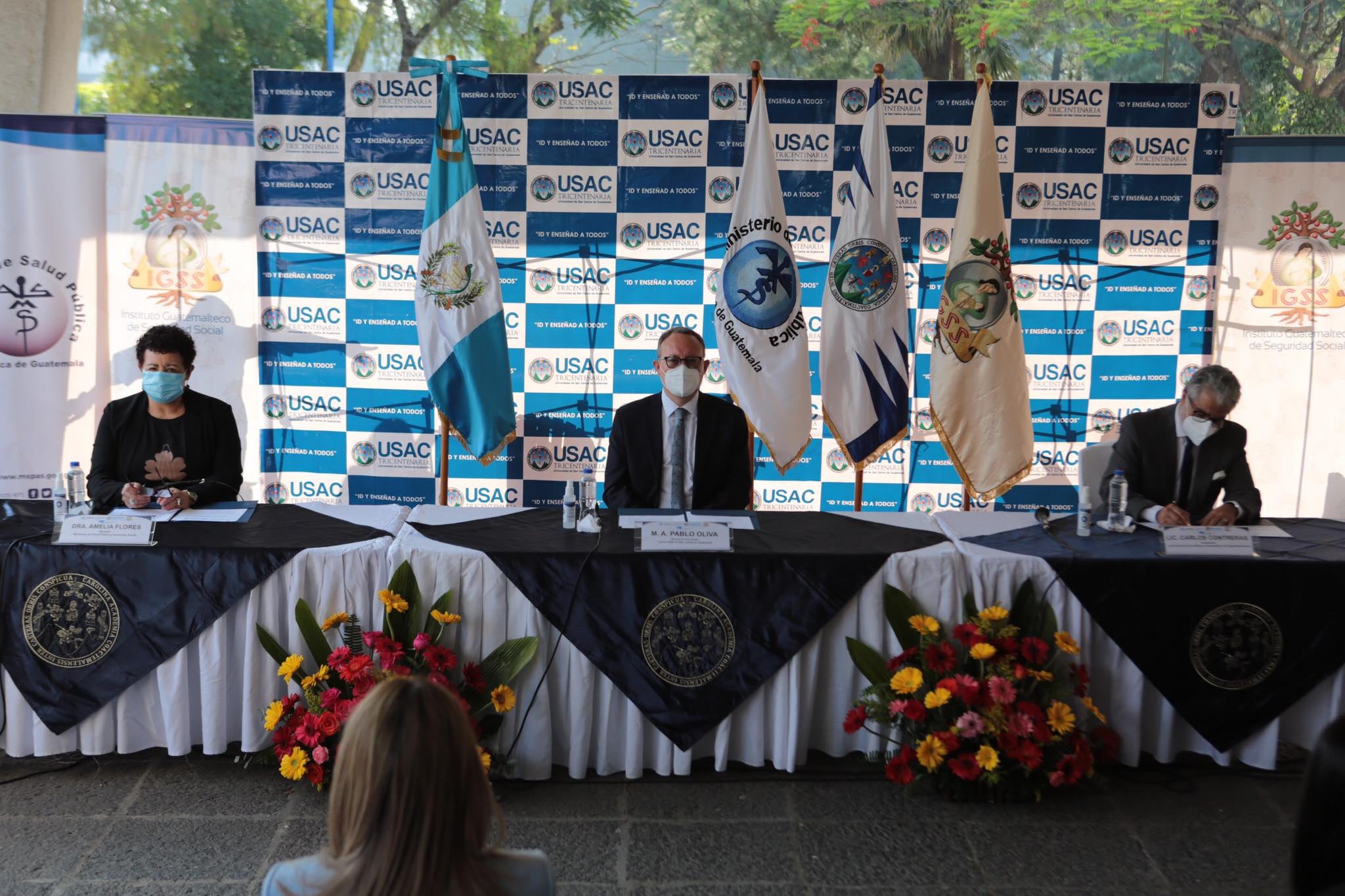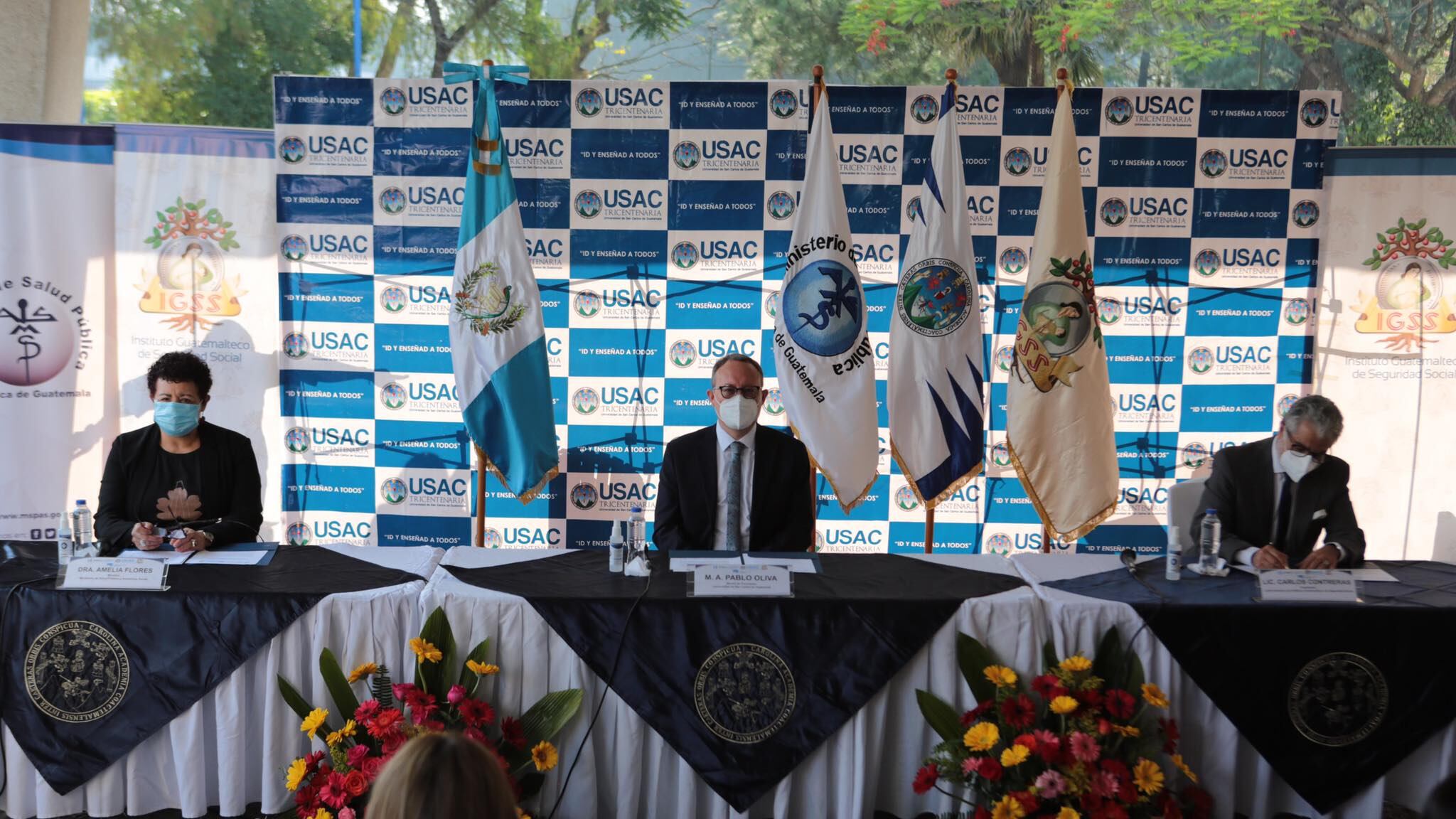 La ministra de Salud, Amelia Flores, junto a Pablo Ernesto Oliva Soto, rector en funciones de la Usac; y Carlos Contreras, presidente de la Junta Directiva del Instituto de Seguridad Social (Igss), en conferencia de prensa participaron en la ceremonia.