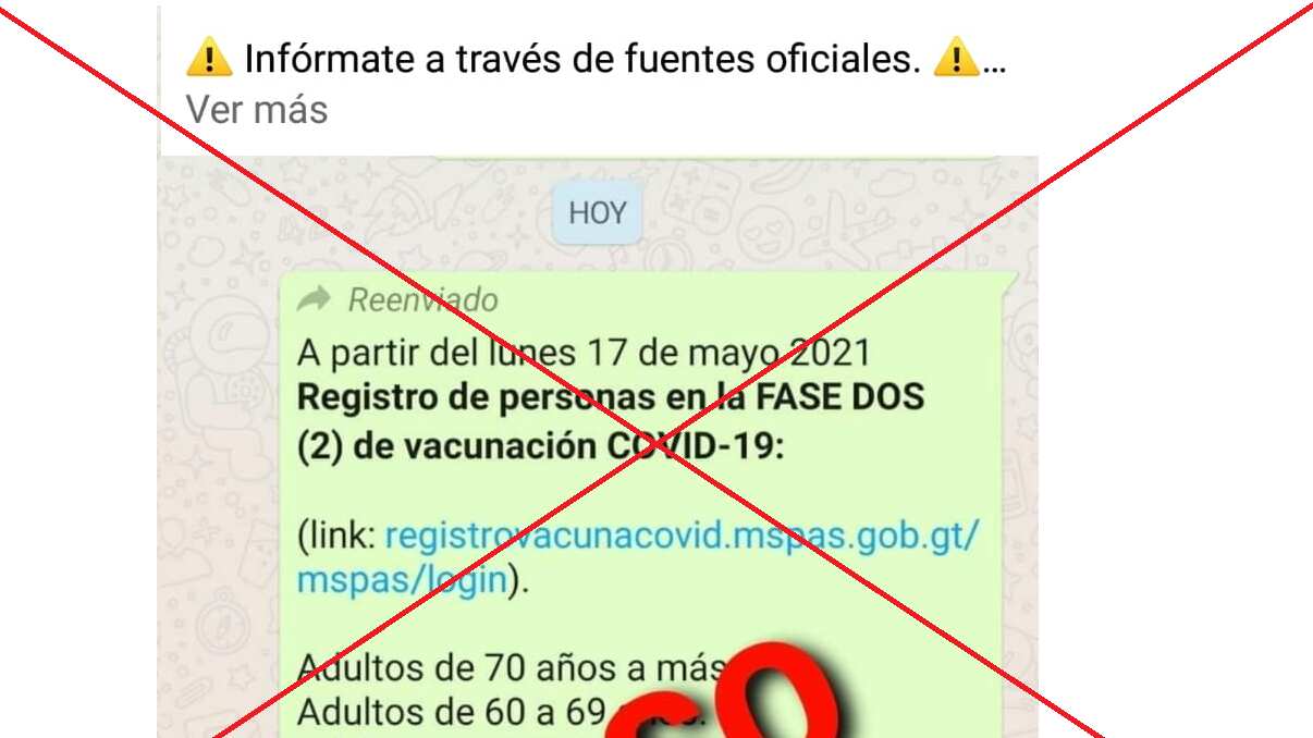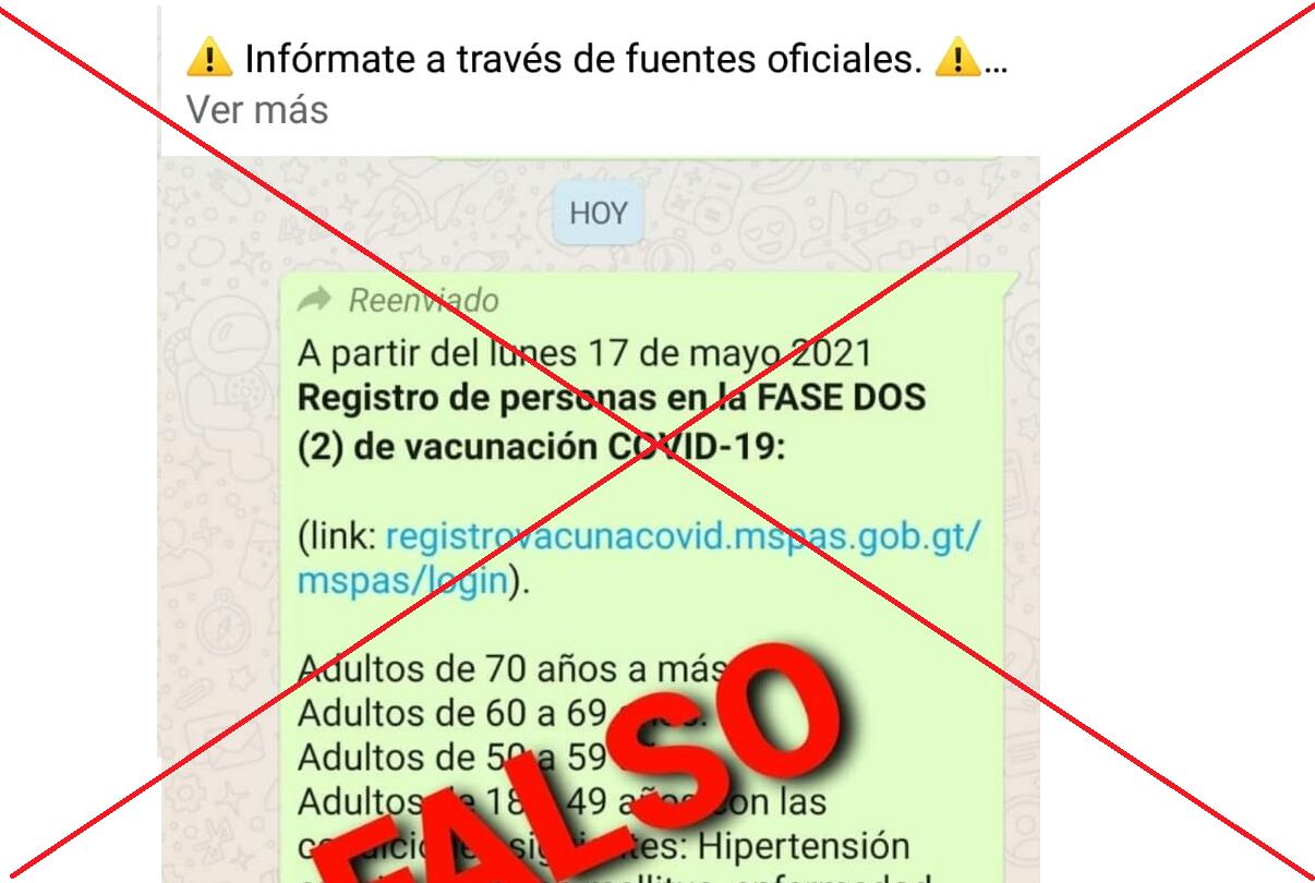 El Ministerio de Salud y Asistencia Social (MSPAS) dio el aviso sobre una publicación en WhatsApp que contiene información falsa, respecto a la segunda fase de la vacunación contra el Covid-19.