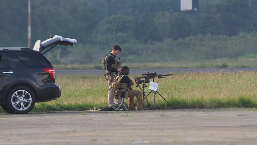 En una área un tanto alejada a la pista de aterrizaje se pudo observar a un agente con un rifle de mira telescópica preparado para cualquier eventualidad. Minutos después se le unió otro agente portando lo que al perecer era un telescopio de tipo caza.