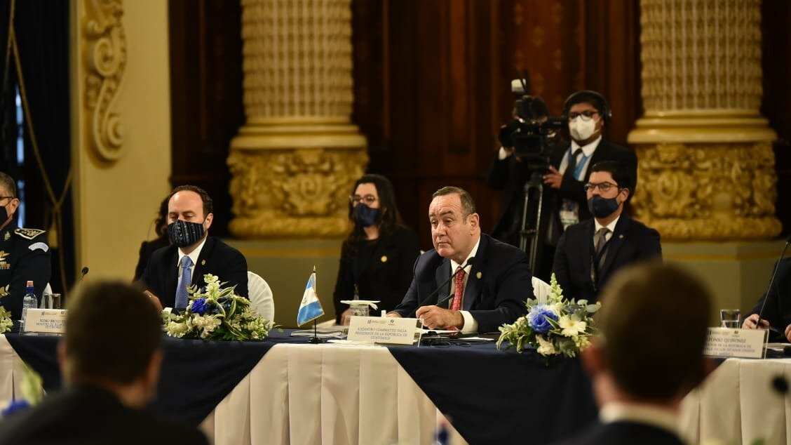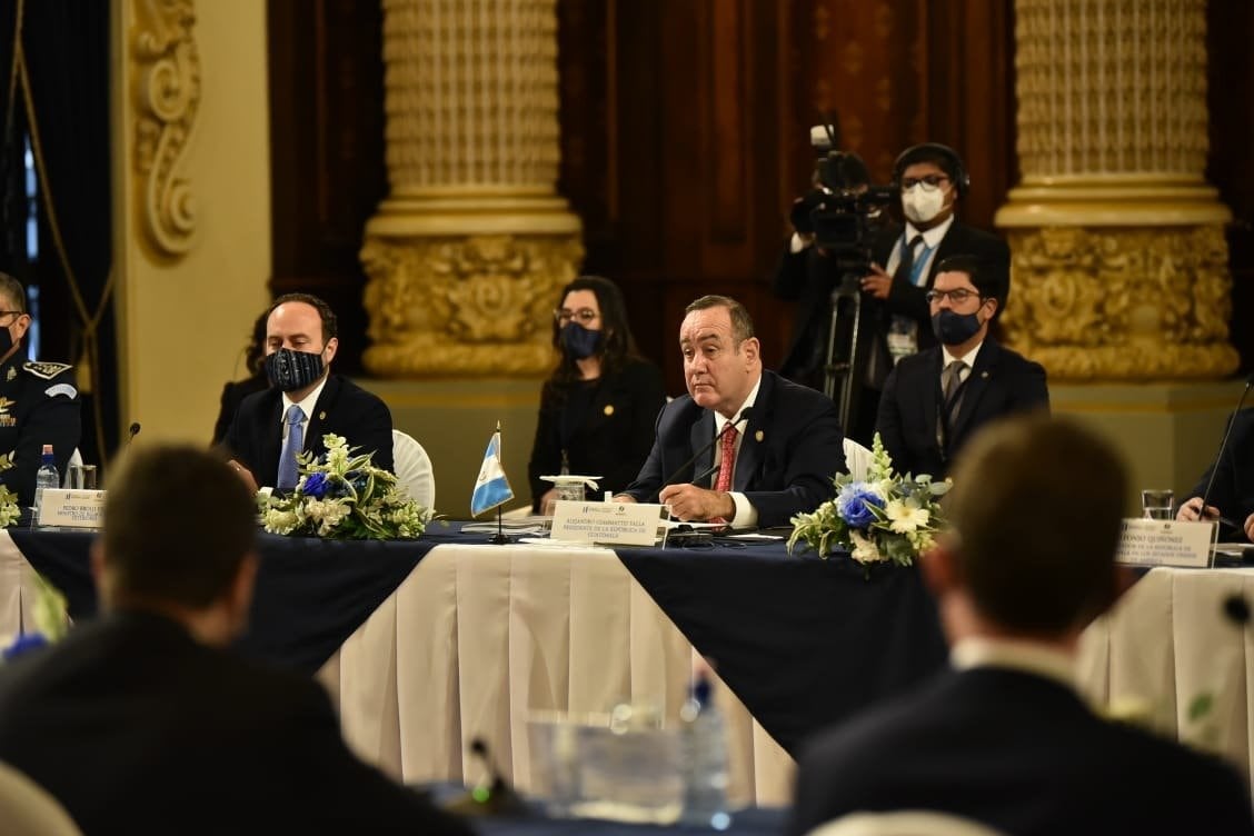 Una vez instalados ambos funcionarios y sus equipos de trabajo en una extensa mesa en el salón Banderas, el presidente Giammattei dirigió una palabras a Harris.