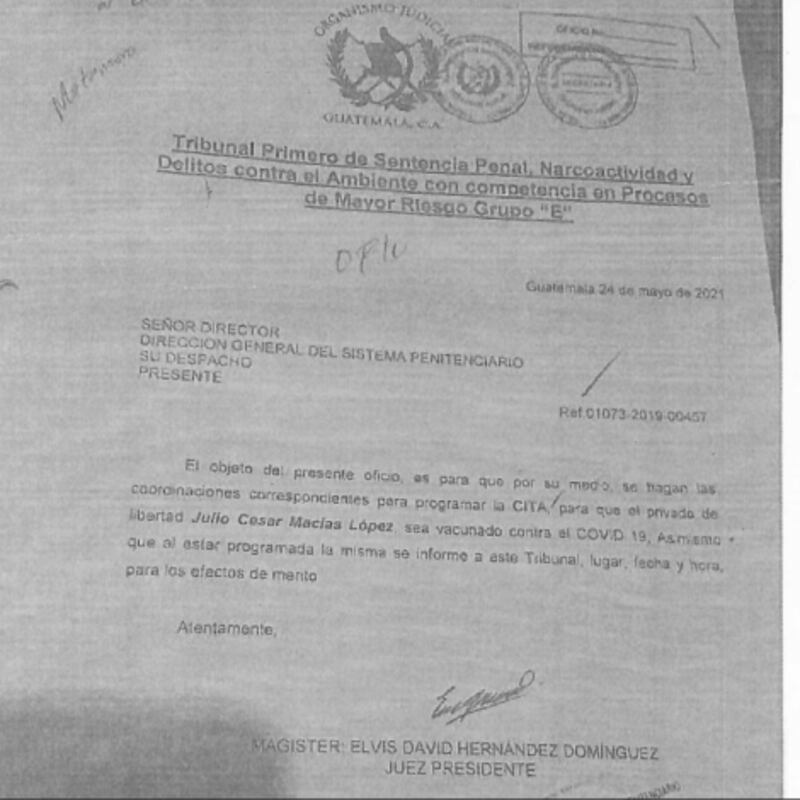 “En relación a programar cita para que el privado de libertad Julio César Macías López -César Montes-, sea vacunado contra el Covid-19, no está demás informarle que el señor Macías López, tiene 79 años de edad”, se lee en el documento.