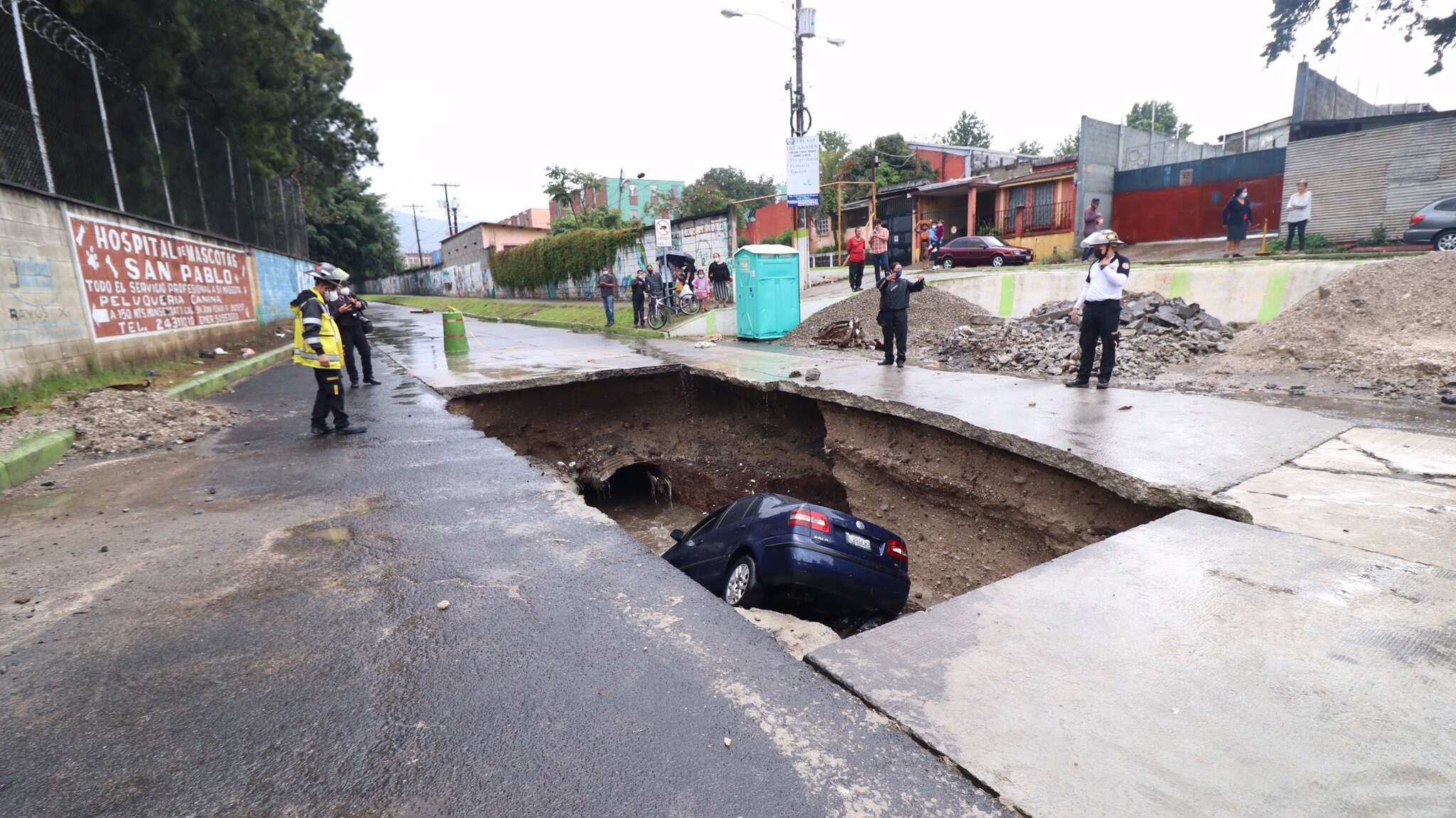 Derivado de un socavamiento en el pavimento ocurrido en un tramo de la avenida principal de la colonia Pablo Sexto, en la zona 7 de Mixco, un vehículo cayó en dicho agujero.