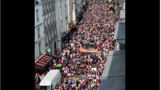 “Libertad”, “No a la dictadura sanitaria”, “Macron dimisión” gritaban miles de manifestantes congregados a orillas del río Sena, en el centro de París, en una de las tres protestas celebradas en la capital.