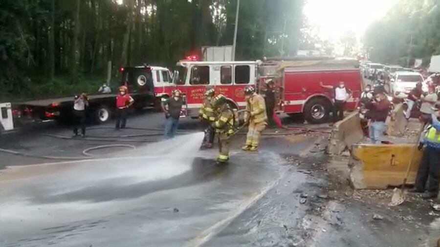 Los socorristas tuvieron que utilizar equipo especial contra incendios y abastecimiento para controlar las llamas del vehículo de transporte pesado que se incendió tras la colisión, pues se derramó combustible al momento del impacto.