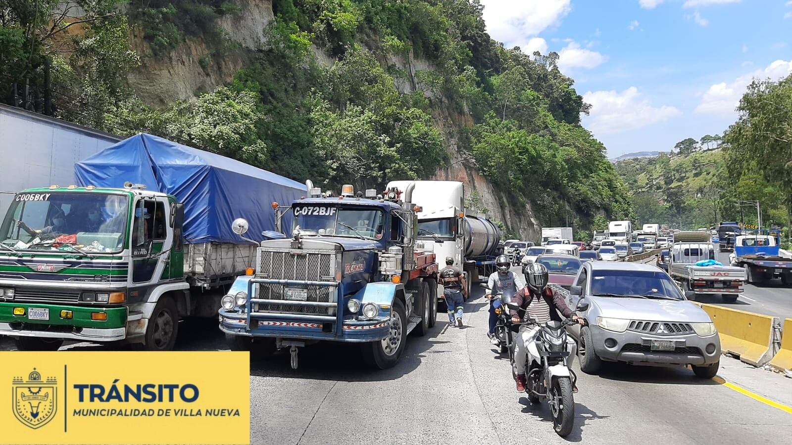 El departamento de tránsito de Villa Nueva informó que un tráiler averiado se está retirando de la vía principal, lo cual podría detener la circulación de vehículos por unos minutos.