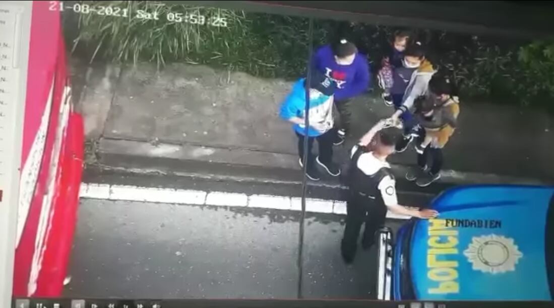 Asimismo, otro hombre abre la parte trasera del bus. Observa el carro policial y camina hacia él. Acerca su mano a la ventanilla y vuelve con dirección al vehículo de transporte de pasajeros.