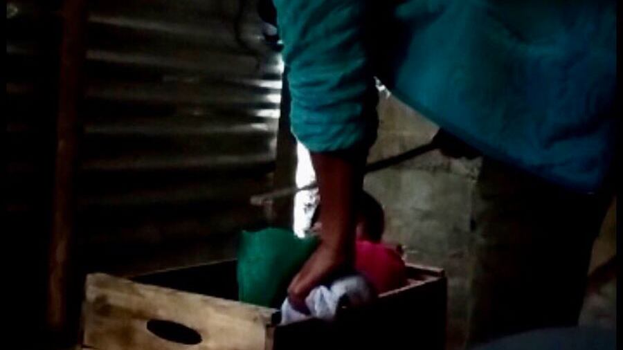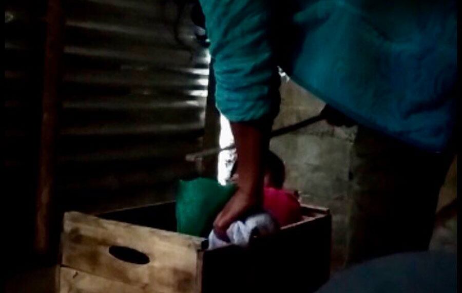 El menor se encontraba llorando, acostado en una caja de madera, cuando la mujer comienza a golpearlo incesantemente.