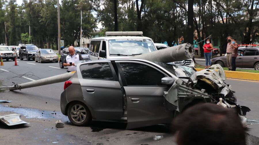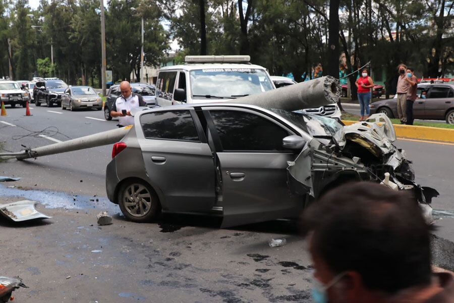 No obstante, el impacto fue de tal magnitud que pasó botando un poste del tendido eléctrico que quedó encima del carro.