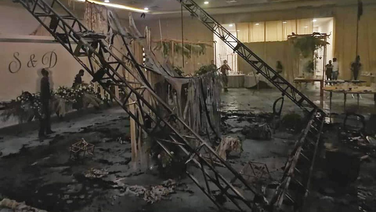 Cuando los novios bailaban su primera canción como esposos, la pirotecnia utilizada por el grupo musical llegó al follaje seco que decoraba el salón y provocó un incendio.