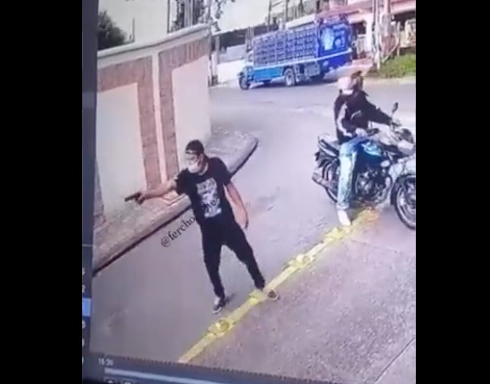 En una cámara de videovigilancia quedó la evidencia de cómo dos “motosicarios” atacaron a balazos a los ocupantes de una camioneta.