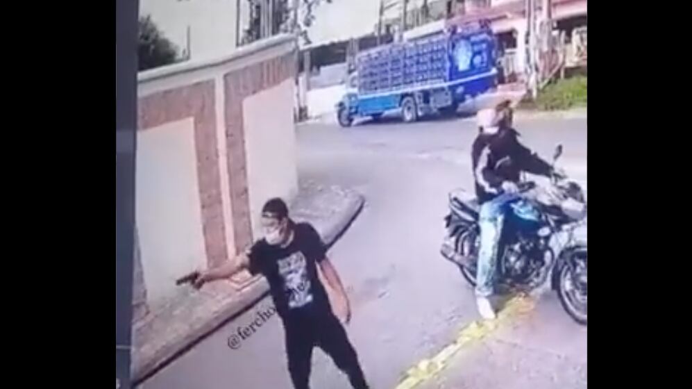En una cámara de videovigilancia quedó la evidencia de cómo dos “motosicarios” atacaron a balazos a los ocupantes de una camioneta.
