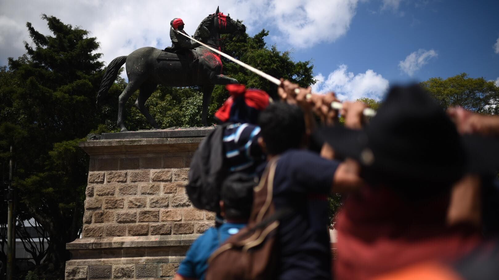 Uno de los manifestantes se subió al monumento del General José María Reina Barrios y con lazos lo amarró de la cabeza para intentar derribarlo.