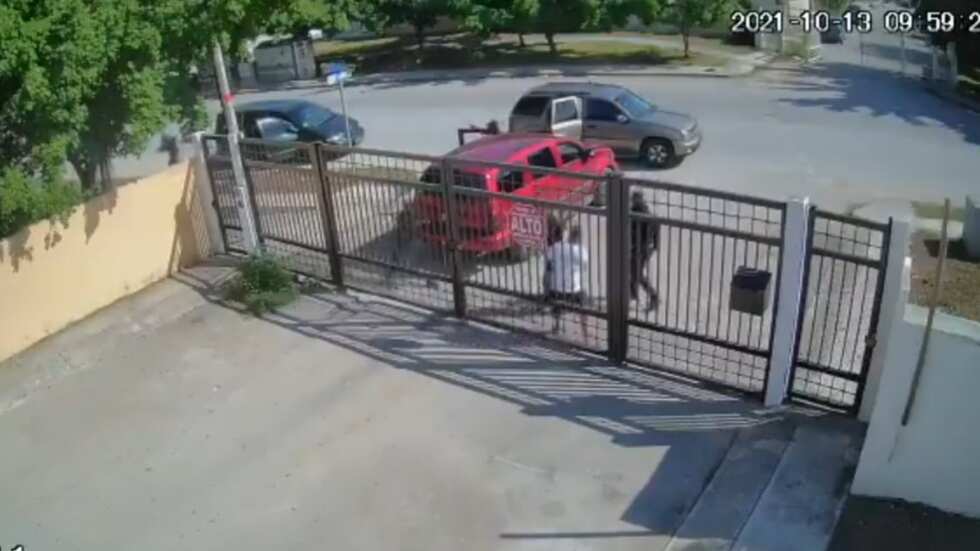 La primera imagen muestra a la víctima, de playera blanca, frente a la reja de su domicilio ubicado en Cancún, México, mientras la camioneta roja tiene la puerta del conductor abierta.