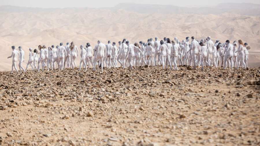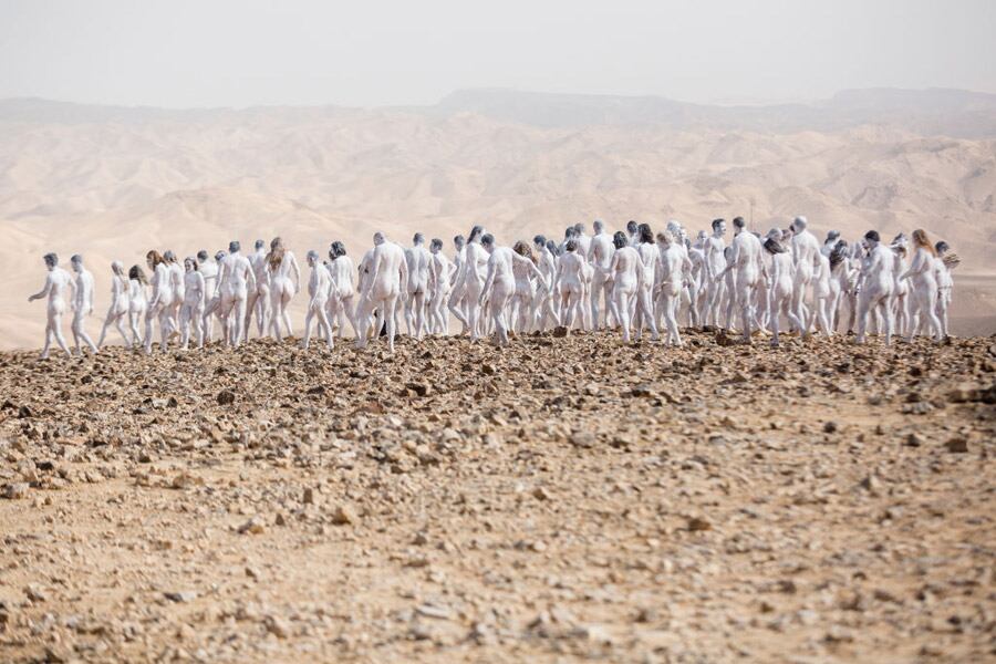 Centenares de personas desnudas pintadas de blanco caminaron por un espacio desértico cerca del Mar Muerto, en el marco del último proyecto fotográfico del artista estadounidense Spencer Tunick.