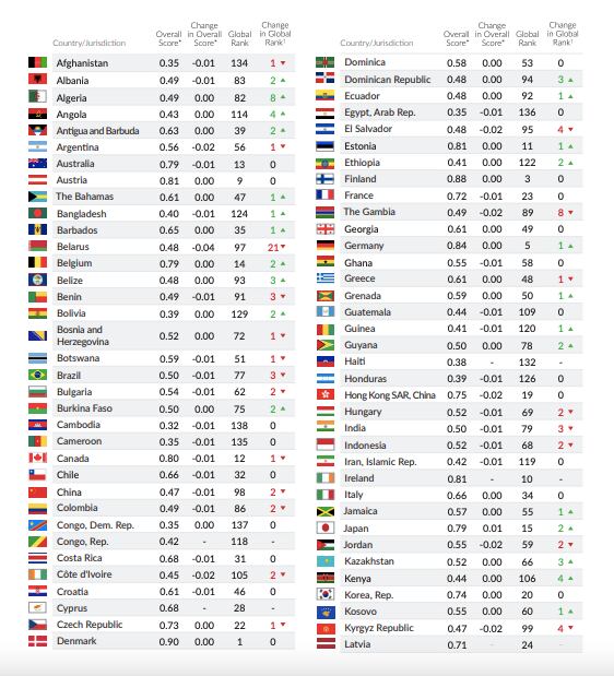 Los países que no son tan favorables sobre Estado de derecho con Honduras con una calificación de 0.39 y se posición en la casilla 129. Mientras que Nicaragua se ubica en la posición 131, bajando tres posiciones y una puntuación de 0.38.