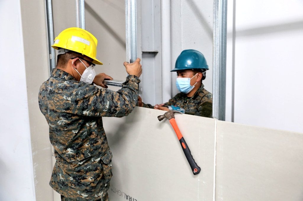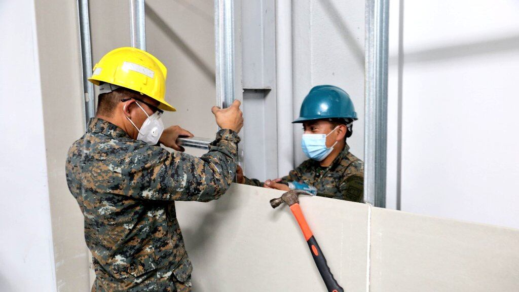 El Cuerpo de Ingenieros del Ejército de Guatemala realiza los trabajos de ampliación del hospital temporal del Parque de la Industria, especializado en la atención de casos de Covid-19.
