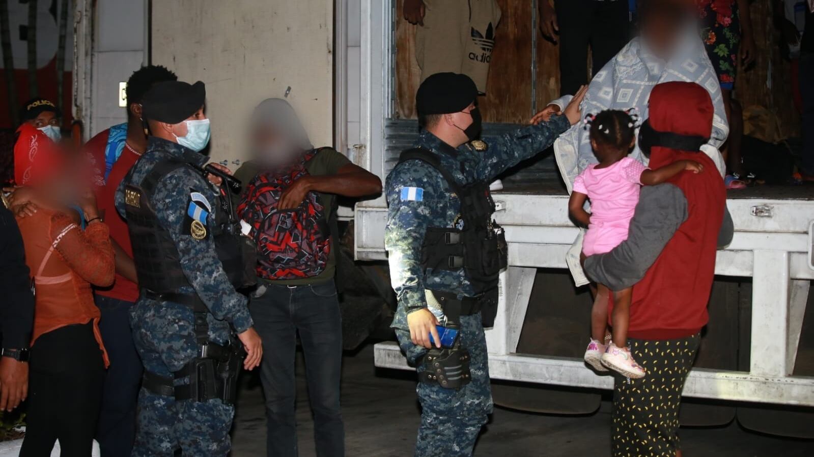 Fotografías difundidas por la policía mostraron a los migrantes bajando del furgón con mochilas o sentados en la carretera. El grupo fue llevado a un albergue del Instituto Guatemalteco de Migración.