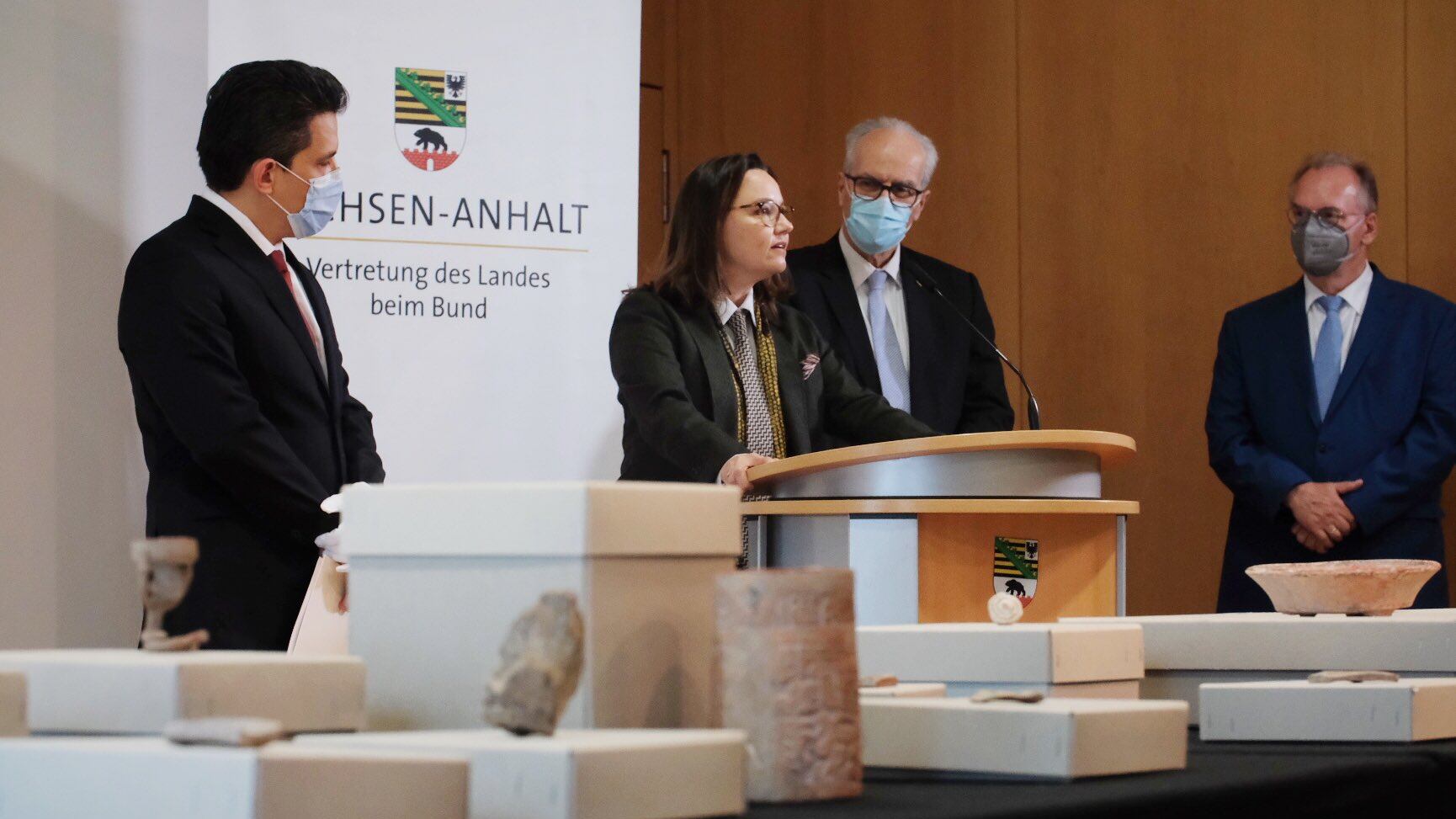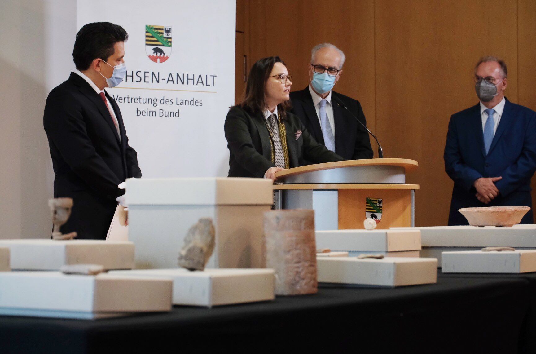 La ceremonia de entrega tuvo lugar en Berlín y estuvo a cargo de Reiner Haseloff, presidente del estado de Sajonia Anhalt, región en la que el año pasado fueron hallados los objetos que ahora entregó a los embajadores Jorge Lemcke Arévalo, de Guatemala, y Francisco Quiroga, de México.