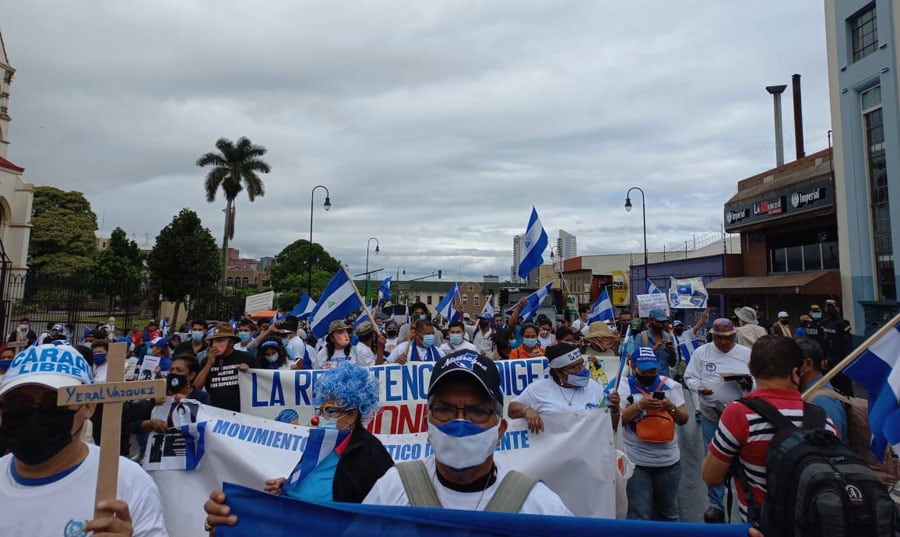 Agitando banderas de Nicaragua y coreando “¡Viva Nicaragua libre!”, unos mil nicaragüenses exiliados en Costa Rica marcharon por San José para exigir la partida del presidente de su país Daniel Ortega, quien se apresta a ser electo este domingo por cuarta vez consecutiva, con sus principales candidatos opositores presos.
