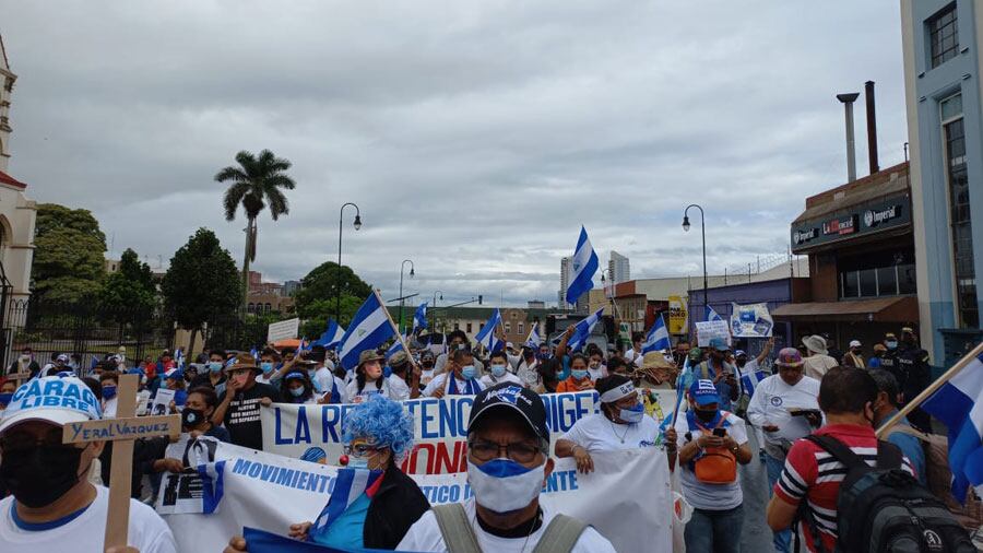 Con música típica nicaragüense, banderas, cintas en la cabeza, camisetas de béisbol y pancartas, el grupo de manifestantes opositores caminó a paso lento recitando consignas como: “¡Viva Nicaragua libre, viva!”; “¡El pueblo unido jamás será vencido” y “¡Los que se van, se van y nunca volverán!”.