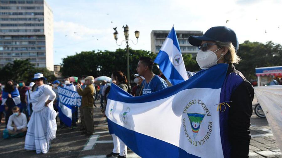Las personas portaron varios carteles con distintas consignas como “nicaragüenses por el mundo unidas contra la dictadura Ortega-Murillo”.