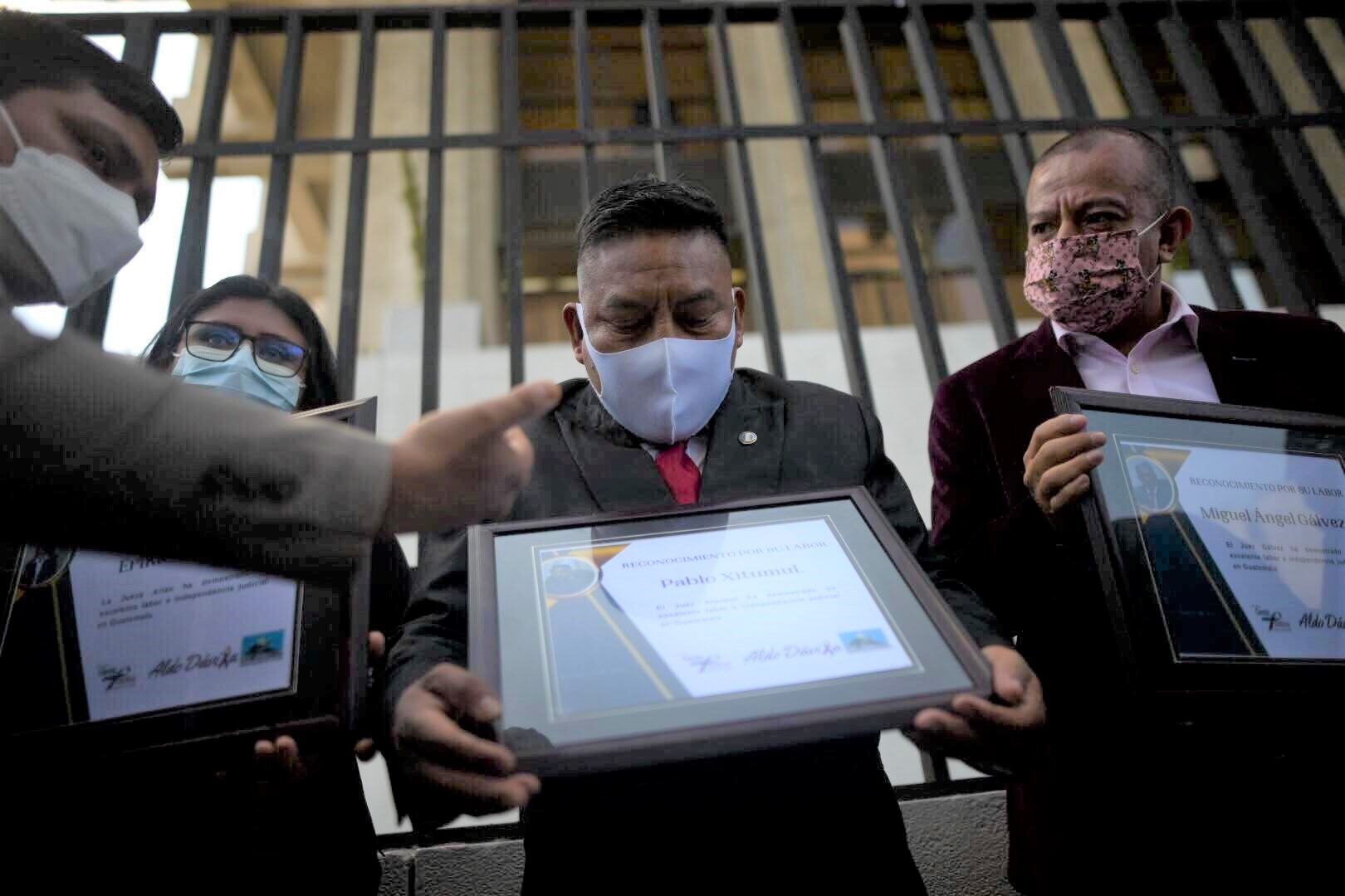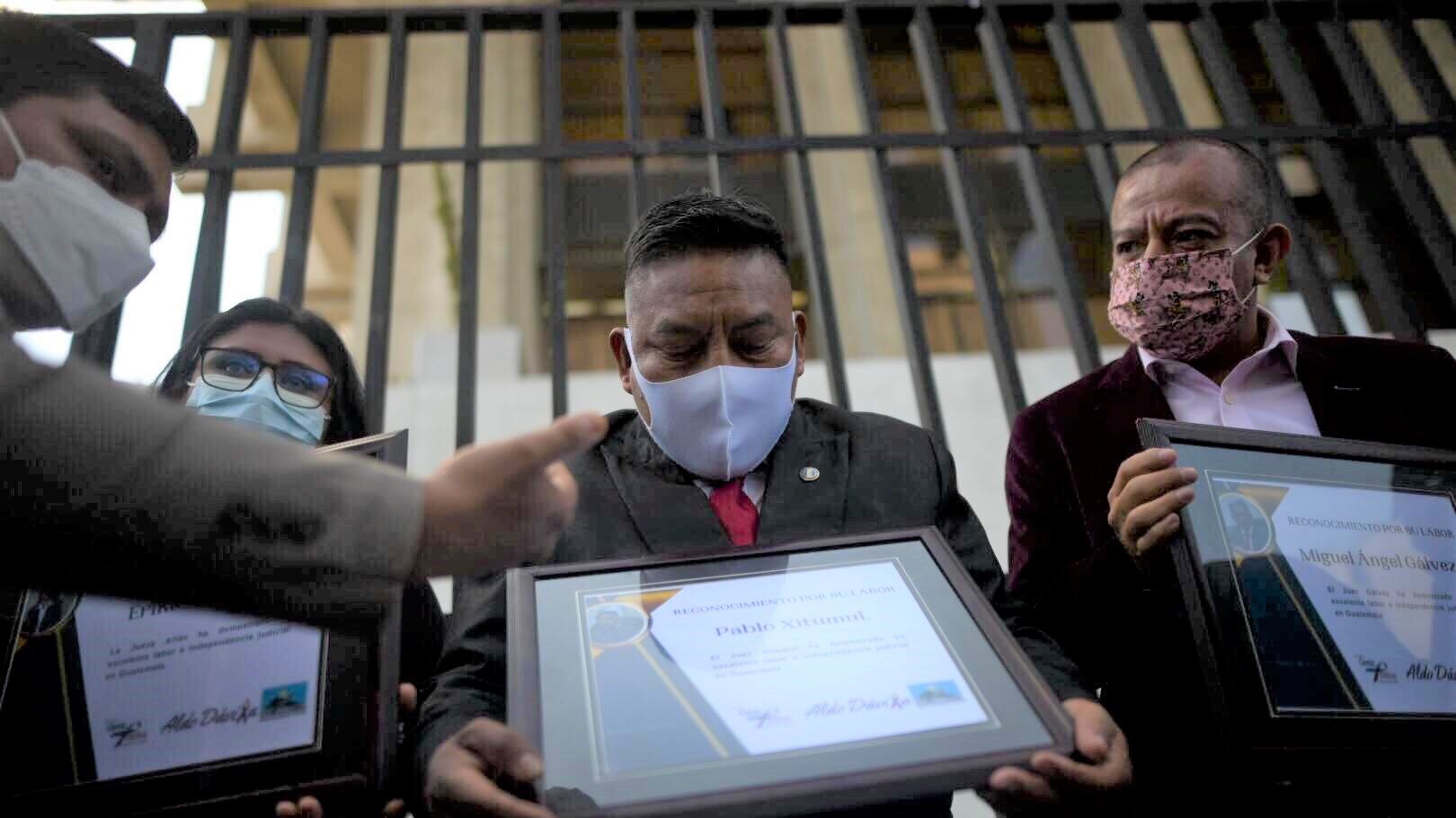 Los jueces de Tribunales que conocen casos de alto impacto: Miguel Ángel Gálvez, Jazmín Barrios, Erika Aifán y Pablo Xitumul, recibieron un reconocimiento por su labor al impartir justicia, en medio de la persecución de la que han denunciado ser objeto.