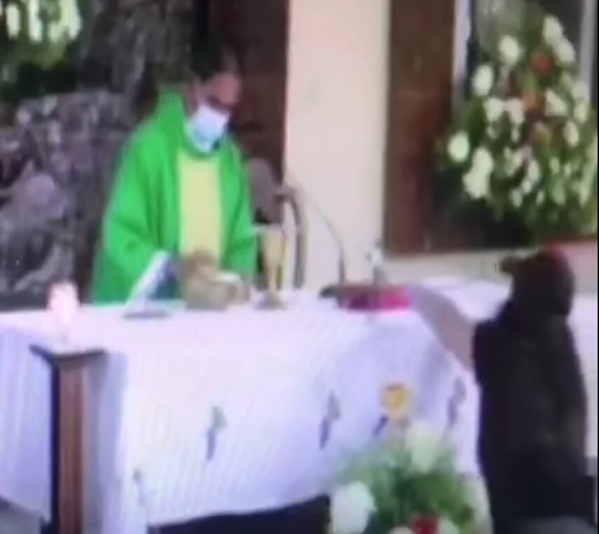 En un video publicado en redes sociales se observa al padre ofrecer la misa cuando de repente la mujer se acerca y tira la cruz que se encontraba en una mesa donde se colocan los objetos litúrgicos para la comunión.