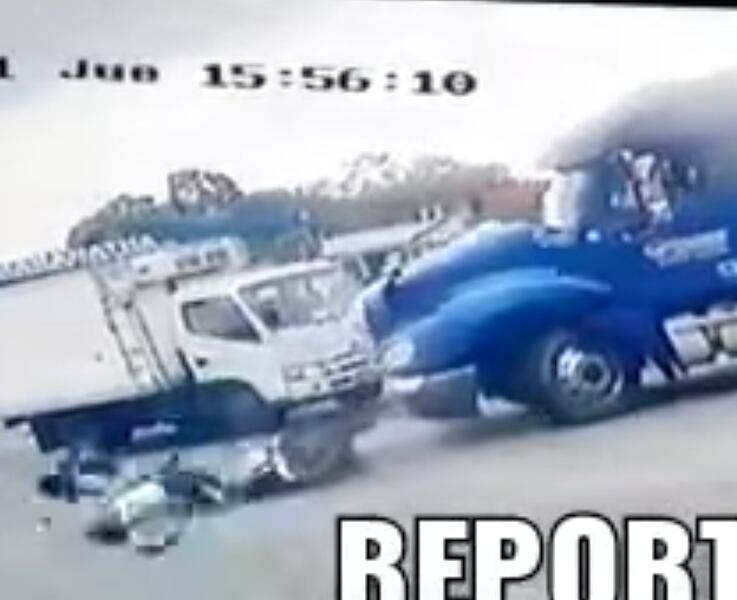 El accidente de tránsito entre una motocicleta y un tráiler quedó grabado por cámaras de video seguridad instaladas en el km 149.4 de la ruta CA-2 Occidente, frente a una gasolinera en la ruta que conduce a San Antonio, Suchitepéquez.